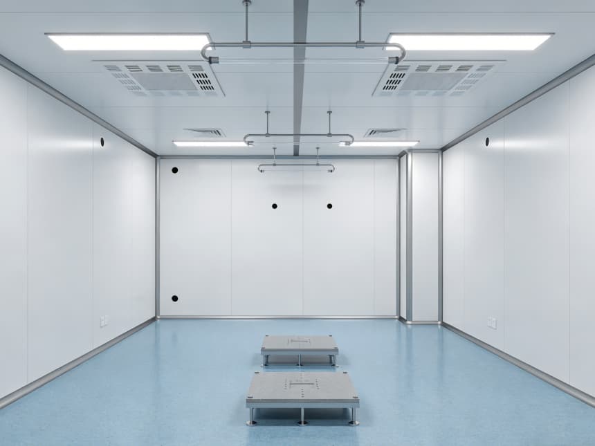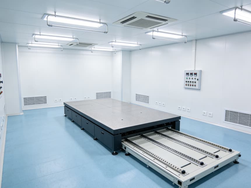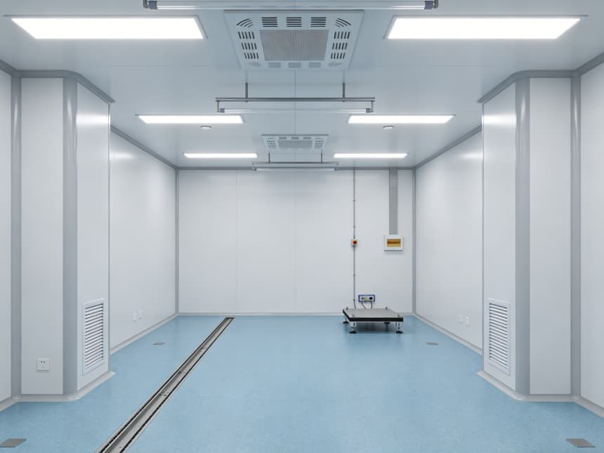 電子光學車間內部細節(jié)設計精準匹配行業(yè)核心需求,整體采用淺藍色防靜電潔凈地坪與白色無縫潔凈墻面的組合,風格簡約統(tǒng)一。地面選用3mm厚環(huán)氧防靜電材質,表面經(jīng)啞光工藝處理,既能有效規(guī)避強光反射對光學檢測造成的干擾,又具備10?-10?Ω的穩(wěn)定防靜電性能;同時兼具優(yōu)異的耐磨特性,可耐受酒精等常用清潔劑擦拭,墻角均采用50mm圓弧設計,從根源上消除積塵死角,筑牢潔凈基礎。