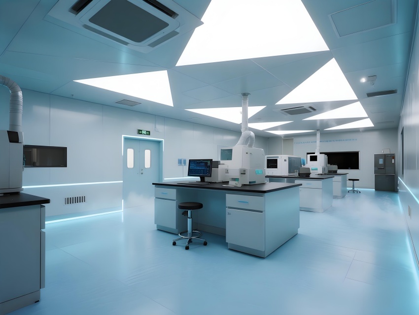 本實驗室以"絕對環(huán)境控制"為核心設計理念,整體采用冰川藍與鈦白灰的漸變配色。墻面嵌入式環(huán)境參數(shù)監(jiān)測屏實時流動著翡翠綠數(shù)據(jù)流,與頂棚矩陣排列的微孔送風口形成科技韻律。核心實驗區(qū)采用圓弧形防結露玻璃隔斷,內(nèi)置百級潔凈層流罩。地面鋪設防靜電陶瓷鋼板,接縫處嵌入LED環(huán)境達標指示燈。設備區(qū)裸露的銀色保溫管道與藍色冷媒管構成工業(yè)美學展陳,智能除濕機組通過半透明外殼展示內(nèi)部冷凝過程。數(shù)據(jù)中控室配備270°曲面監(jiān)控屏,懸浮粒子濃度以動態(tài)星云圖呈現(xiàn)。空間通過嚴謹?shù)膸缀畏指钆c流體力學曲線結合,在極致環(huán)境控制要求下,打造出兼具科研嚴肅性與星際艙未來感的頂級實驗環(huán)境。