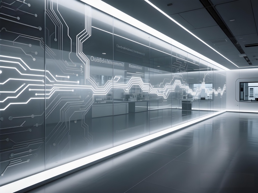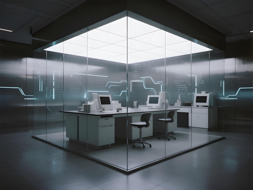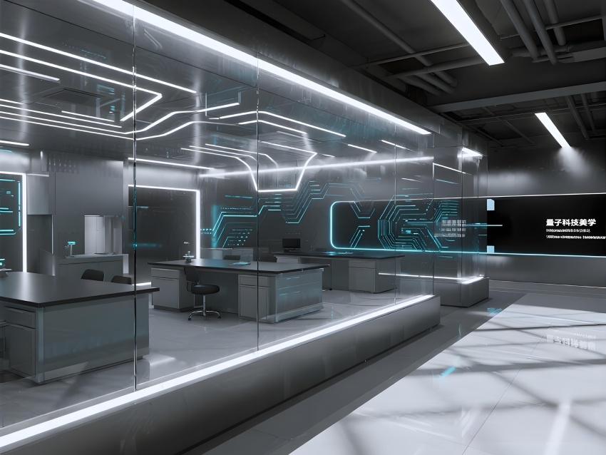 本實驗室采用"量子科技美學"設計,將納米尺度的精密感轉化為空間敘事。主實驗區以鏡面銀與深空灰為基調,半透明防輻射玻璃墻體內嵌電路板紋理光帶,象征微觀世界的電子軌跡。百級潔凈區的金色氣流箭頭與千級區的藍色光暈形成能級躍遷般的視覺分級,CVD設備艙的蜂窩狀散熱孔與懸浮式控制面板構成未來工廠意象。地面導光纖維模擬分子結構網絡,天花板動態粒子監測屏以數據流形式投射納米顆粒分布。通過冷調LED與設備熒光的層次照明,在滿足EMI屏蔽與化學防護需求的同時,創造出如同操作量子領域的沉浸式科研環境,透明氣閘門上的全息警示標志進一步強化尖端材料研究的科技儀式感。