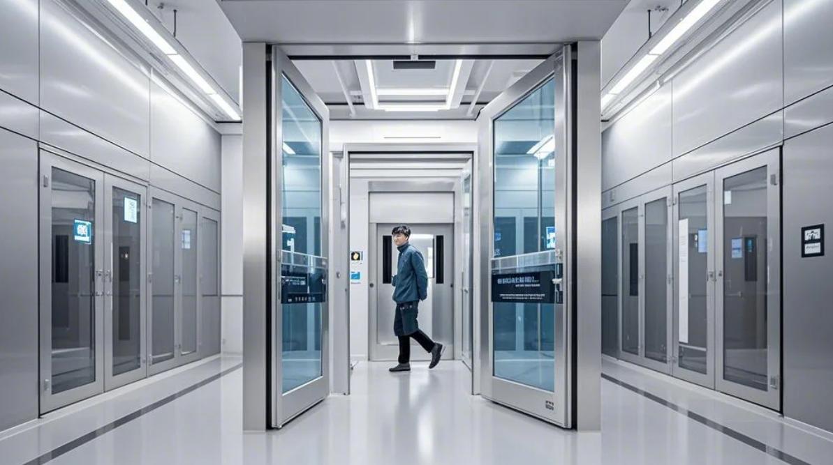 半導(dǎo)體晶圓廠潔凈車間,工業(yè)級(jí)無(wú)塵環(huán)境設(shè)計(jì)。更衣區(qū)設(shè)置環(huán)氧樹(shù)脂自流平地坪,墻面嵌入正壓送風(fēng)百葉,紫外線消毒衣柜線性排列。風(fēng)淋通道配備360度旋轉(zhuǎn)氣流噴嘴,頂部