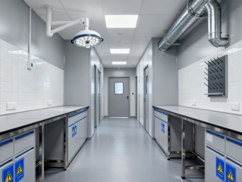本生化研究實驗室凈化工程嚴格遵循ISO7級潔凈標準,將實驗空間科學劃分為四大核心功能區域:樣品前處理區配備通風櫥、震蕩儀等預處理設備,采用負壓設計防止交叉污染;試劑配制區設有獨立的天平室與超純水系統,通過溫濕度智能調控系統將環境參數穩定控制在±1℃與45%-60%RH;精密檢測區配置防震臺與電磁屏蔽裝置,可滿足高效液相色譜、質譜儀等精密儀器的運行需求;無菌操作區配備層流凈化工作臺與生物安全柜,配合動態浮游菌監測系統,確保實驗環境達到百級潔凈度標準。各功能區通過氣密式緩沖間與機械互鎖傳遞窗形成物理隔離,構建起三級防護屏障。在保障蛋白質分離純化、核酸提取擴增等常規實驗高效開展的同時,還專門設計了酶活性檢測專用恒溫恒濕實驗室,采用獨立的凈化空調系統與UPS不間斷電源,可支持對環境參數高度敏感的高精度研究項目。此外,工程特別設置雙通道應急處理系統,包含緊急洗眼裝置、消防噴淋系統與防化物資儲備間,配合逃生路線熒光標識與應急照明系統,全方位保障實驗人員安全與科研數據完整。?