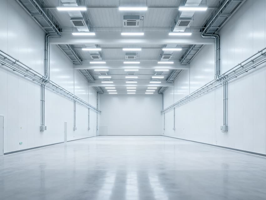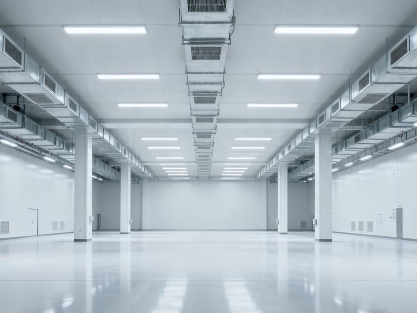 內(nèi)部6個生產(chǎn)車間均為無設(shè)備空曠布局,按工業(yè)級潔凈與承重標(biāo)準(zhǔn)建設(shè):地面鋪設(shè)耐磨防靜電環(huán)氧地坪,墻面采用白色環(huán)保潔凈墻板,陰陽角做圓弧處理減少積塵;柱網(wǎng)間距達(dá)10米,預(yù)留設(shè)備安裝與物流通道空間;頂部整合恒溫恒濕新風(fēng)系統(tǒng)與節(jié)能LED照明,管線暗藏于吊頂內(nèi),避免空間雜亂;車間之間通過通透玻璃隔斷銜接,進一步強化整體空曠感,為新能源產(chǎn)品規(guī)模化生產(chǎn)、柔性產(chǎn)線調(diào)整提供高效、潔凈的空間支撐。