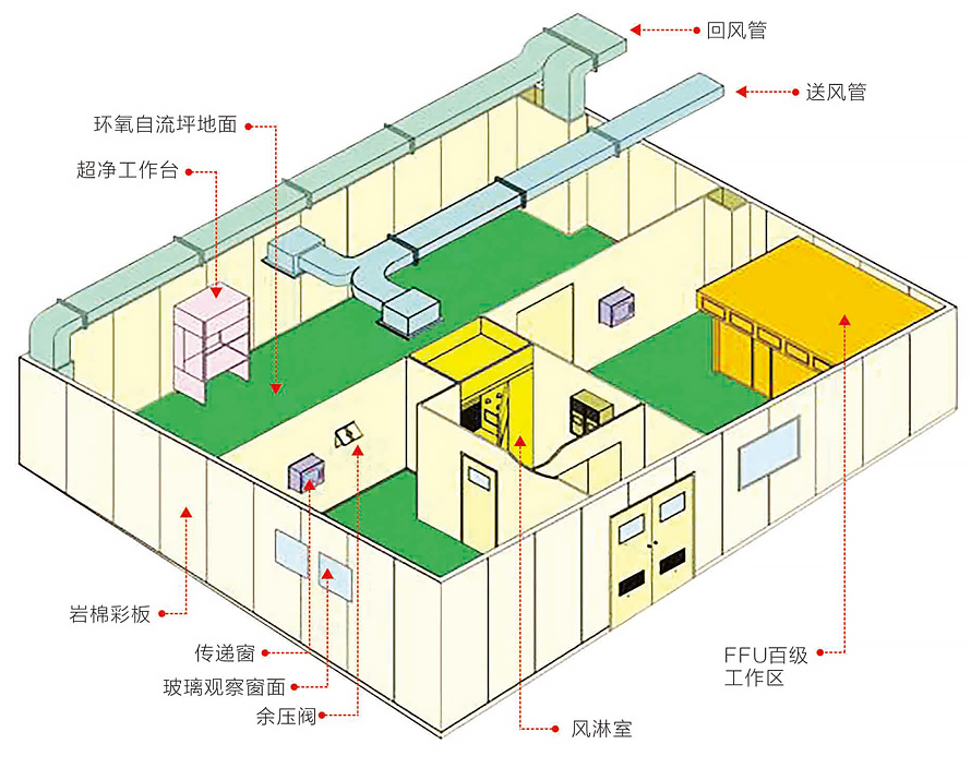 潔凈廠房亦名潔凈室、超凈間、無菌車間、凈化房等,定義為將一定空間范圍內空氣中的微塵粒子,有害空氣,細菌等污染物排除,并將室內之溫濕度、潔凈度、室內壓差、氣流速度與氣流組織、噪音震動及照明、靜電等控制在一定范圍內,而所給予特別設計的密閉空間。