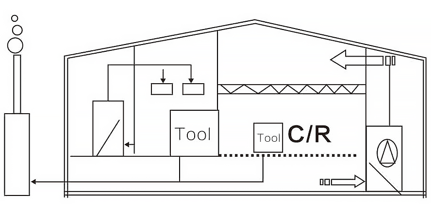 2、單夾層、集中送風、上夾層為靜壓箱.