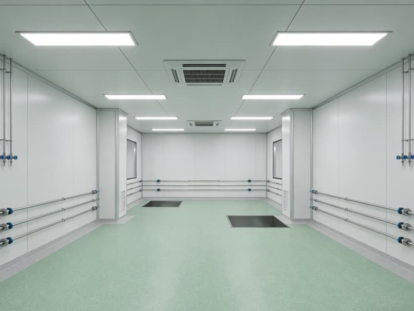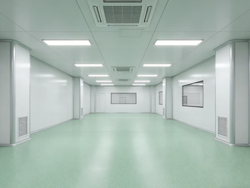 車間內(nèi)部施工工藝凸顯專業(yè)優(yōu)勢:地面采用淺綠色環(huán)氧自流平施工工藝,經(jīng)基層打磨、界面處理、環(huán)氧砂漿找平、自流平罩面四道工序,表面平整度誤差≤1mm/m,兼具抗菌、抗化學(xué)腐蝕特性;墻面采用白色潔凈抗菌涂層施工,推行無縫拼接工藝,陰陽角采用圓弧倒角處理,杜絕清潔死角,涂層附著力達(dá)1.5MPa以上,滿足頻繁消殺需求。