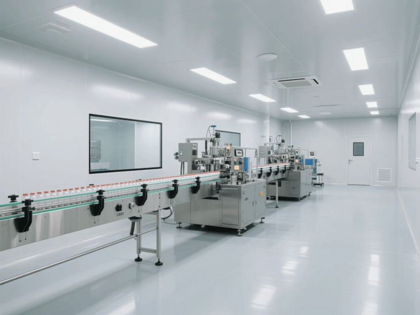 本工程嚴(yán)格遵循GMP及ISO14644-1Class8標(biāo)準(zhǔn),專為無(wú)菌制劑灌裝生產(chǎn)打造高標(biāo)準(zhǔn)潔凈環(huán)境。整體采用醫(yī)療級(jí)白色抗菌彩鋼板與淺灰環(huán)氧自流平地坪的潔凈配色方案,營(yíng)造安全、專業(yè)的無(wú)菌生產(chǎn)氛圍。