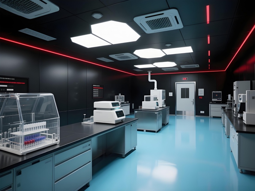 本實驗室采用"生物防御未來主義"風格,通過銳利的幾何切割與警示色彩構建科研防護美學。核心實驗區以啞光黑墻面搭配紅色應急光帶,形成視覺危險預警,與清潔區的