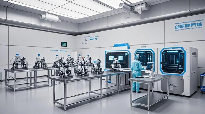 機械人研發實驗室,未來科技風格。實驗室分為研發區、測試區、裝配區和辦公區。研發區占50%,測試區占30%,裝配區占10%,辦公區占10%。研發區:防靜電環氧地坪(淺灰色),