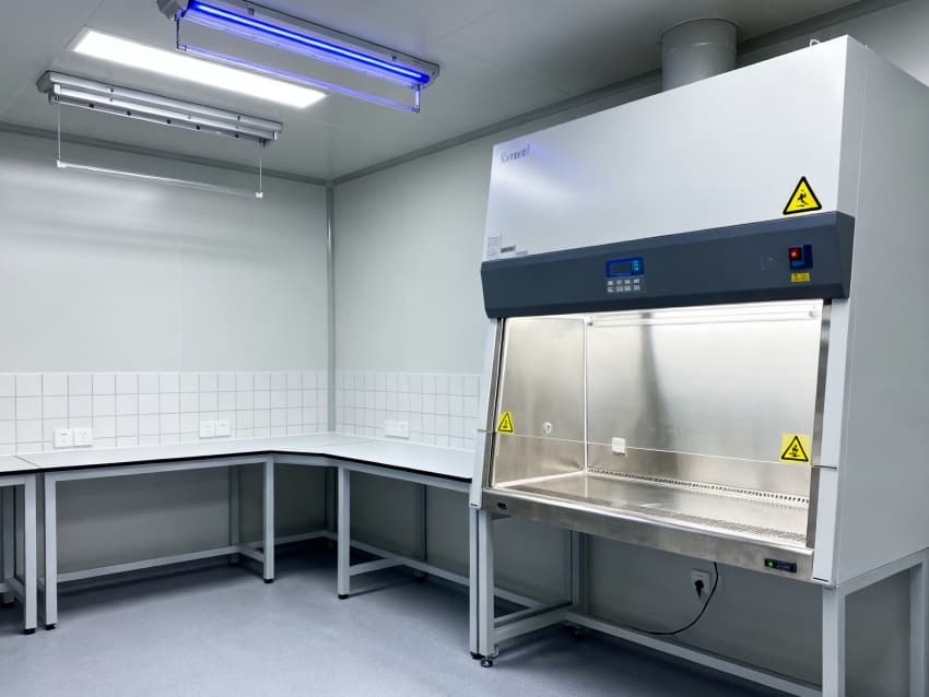 圍護(hù)結(jié)構(gòu)選用304不銹鋼抗菌墻板與無縫PVC地面,轉(zhuǎn)角圓弧處理無衛(wèi)生死角,配套紫外消毒系統(tǒng)與恒溫恒濕控制(22±1℃,50±5%RH),全面滿足微生物研究的無菌環(huán)境要求。