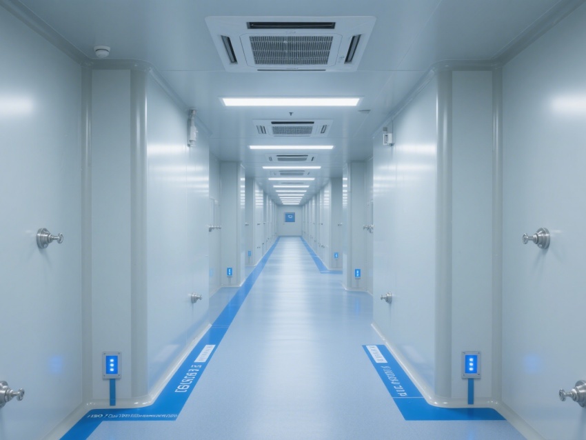 走廊采用一體化潔凈設(shè)計(jì),地面藍(lán)色標(biāo)識線清晰規(guī)劃動線,各類管線與設(shè)備布局兼顧功能性與美觀性。整體工程通過材質(zhì)選用、空氣凈化、智能監(jiān)控的協(xié)同,為芯片檢測提供了超潔凈、高穩(wěn)定的專業(yè)環(huán)境,有力保障芯片檢測的精度與可靠性,是芯片研發(fā)與質(zhì)量把控的核心技術(shù)支撐單元。
